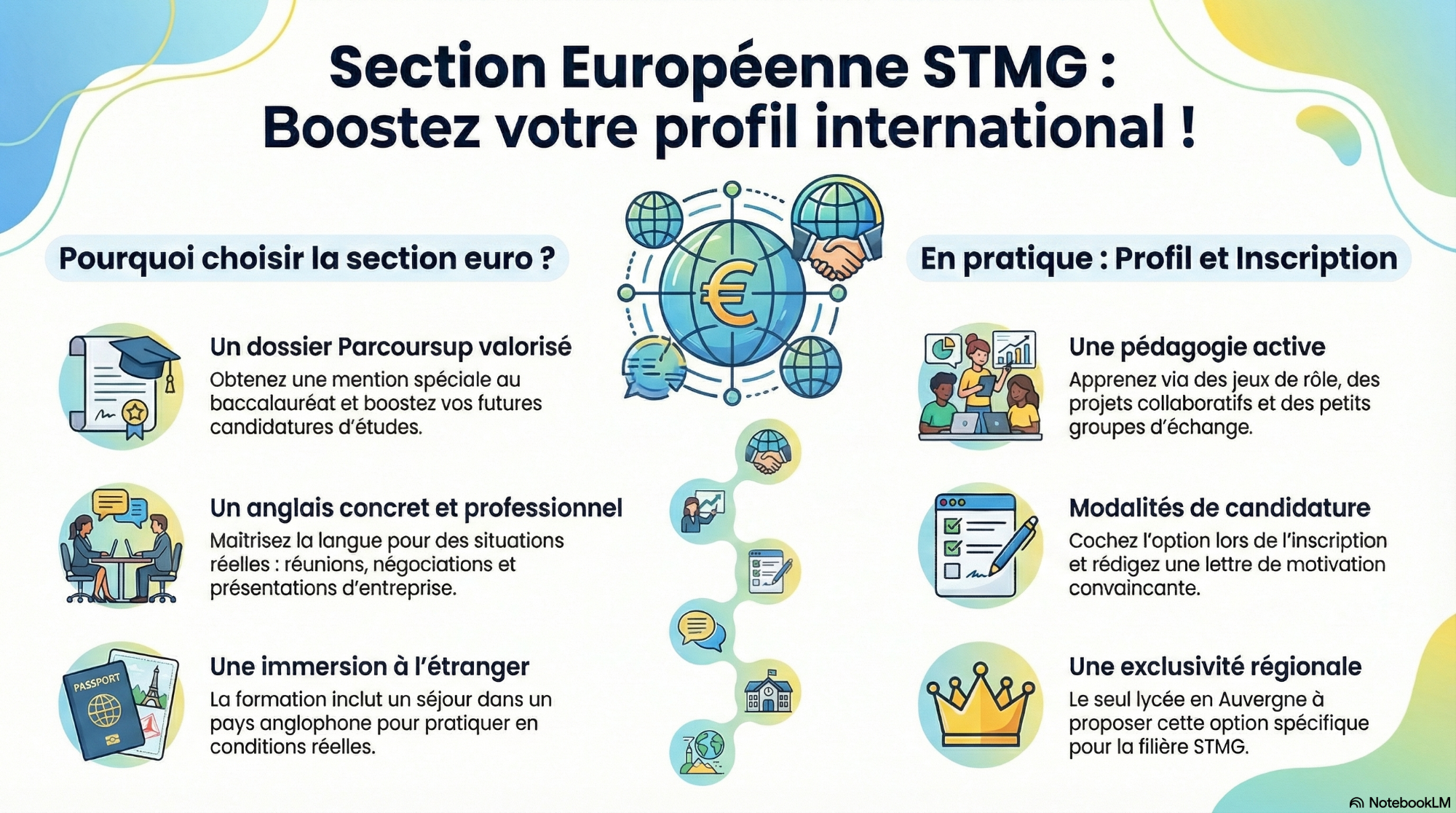 Avec la section européenne STMG, tu développes un anglais vivant, concret et utile. Ici, il ne s’agit pas seulement de faire de l’anglais scolaire : tu travailles l’anglais du monde professionnel, de l’économie et de l’entreprise.