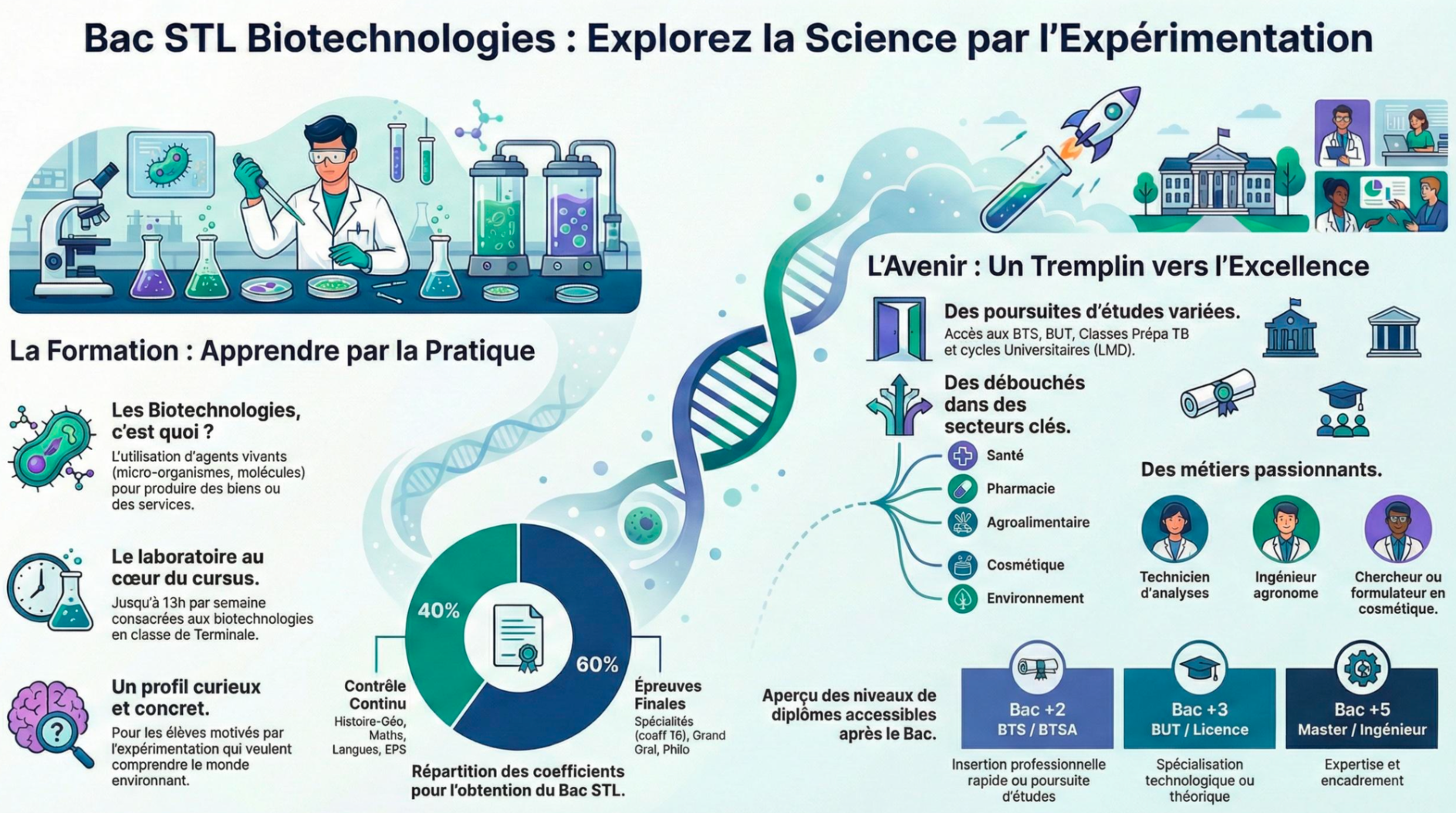La série STL, spécialité Bio-technologies permet de découvrir le fonctionnement des laboratoires. Les biotechnologies correspondent aux technologies utilisant des agents issus du vivant (micro-organismes, biomolécules) pour produire des biens ou des services.